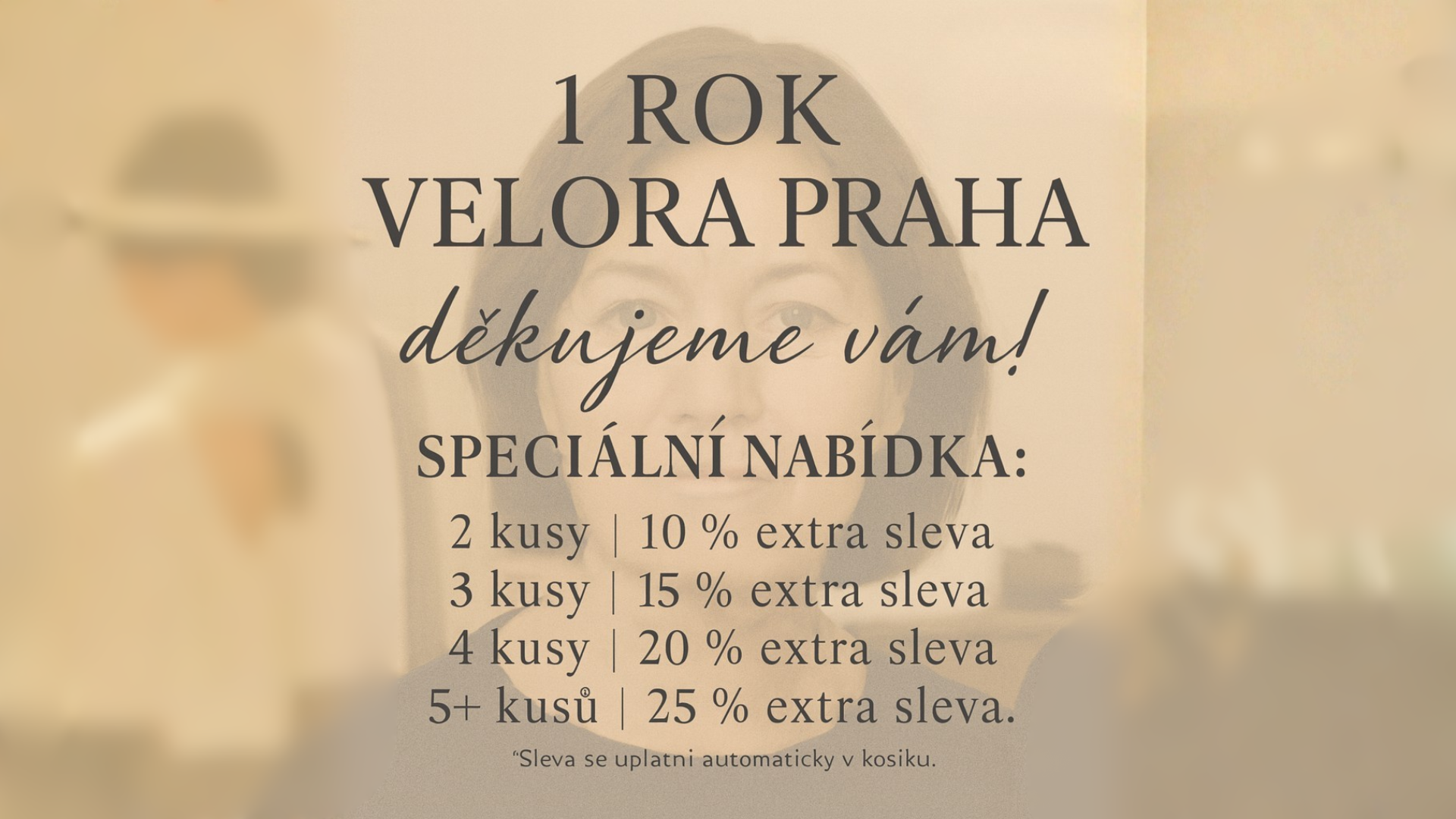 Slavíme výročí! Je to už rok, co jsem převzala Velora Praha po své mamince – a díky vám, našim věrným zákazníkům, můžeme růst dál. Připojte se k oslavě s naší speciální výprodejní akcí.